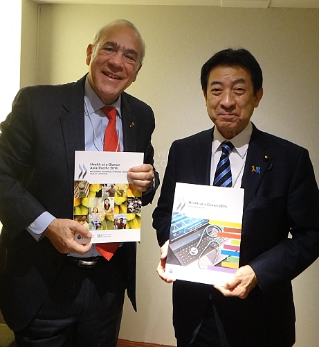 OECDのアンヘル・グリア事務総長と昨年4月の東京以来の再会。データに基づく定量分析が強みのOECDとは、既に昨年のG7保健大臣ベルリン会合でも、AMRに関するレポート取りまとめをするなどの協力関係にあり、今後も高齢化、医療の質向上、雇用政策等、広範な協力強化で合意。