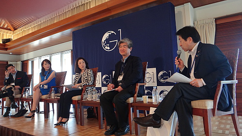 第8回G1サミットの「国際機関における日本のプレゼンス向上に向けて」とのセッションにて、世界のルールや標準の設定への影響力を持ちながら、国際貢献をするために、日本は何をすべきか、熱く議論。左から世界経済フォーラム日本代表の土屋聡氏、森まさ子参議院議員、多数国間投資保証機関(MIGA)の本田桂子長官、WTO貿易政策検討部参事官の早藤昌浩氏。