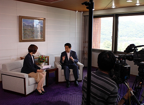 松山の地元放送局にて閣僚としてインタビューを受ける。