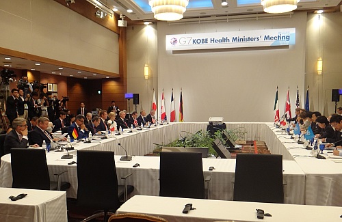 いよいよG7神戸保健大臣会合が始まる。向かって右中央に議長役の私が開会のご挨拶中。G7以外の常時出席者はECコミッショナーとWHO事務局長。