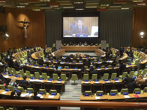 国連総会において初めてハイレベル全体会議において取り上げられた薬剤耐性問題に関し、日本政府を代表して意見表明。私は左奥最後列、奥から二人目に座る。
