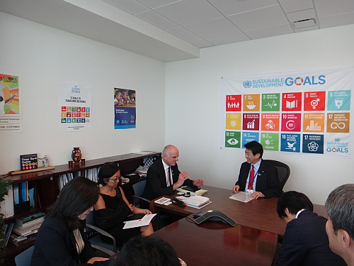 昨年の国連総会で採択されたSDGs(Sustainable Development Goals:持続可能な開発計画)の実現のためのSDGs 特別顧問を務めるナバロ氏を国連本部に訪ね、意見交換。会談の最後に、正式に英国政府の後押しを得たので、23日(金)の朝締め切りのWHO の事務局長選挙に立候補することを決めた、との報告を頂く。