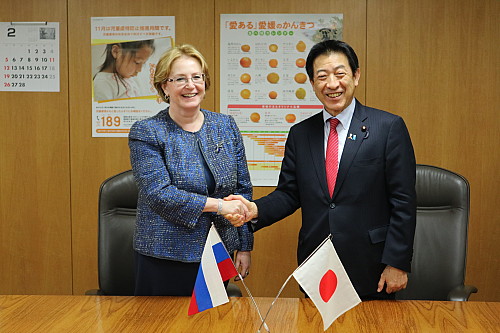 プーチン大統領の来日を前に、ロシアのスクヴォルツォヴァ保健大臣と、医療・保健分野における二国間協力の基本的な考え方や具体的な協力の分野を示した協力覚書に署名。