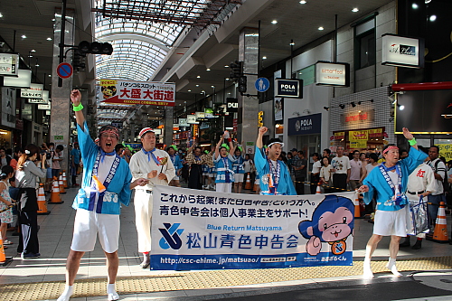 地元松山の夏祭り「松山まつり」に参加し、「青色申告会」の皆さんと野球拳おどりを披露。