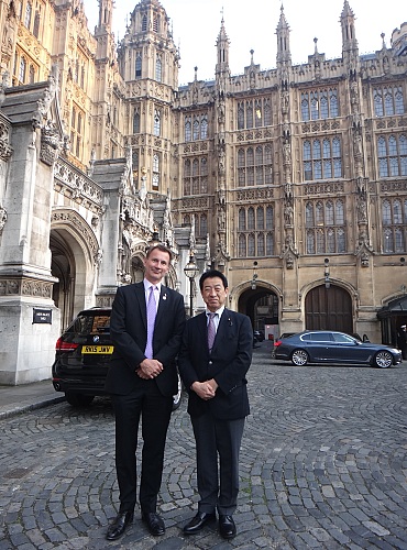 日英21世紀委員会第34回合同会議参加のため、6日にロンドン入り。日本通でもあるハント保健大臣を保健省に訪ねたところ、議会採決がある、とのことで、保健省と地下でつながっている英国議会議事堂内の閣僚のための個室で旧交を温め、議事堂前でツーショット。