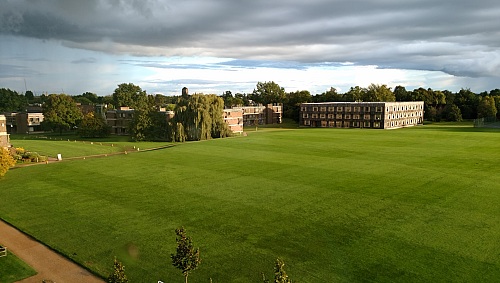 ケンブリッジ大学チャーチル・カレッジにある研修施設、モラーセンターの宿泊施設前に広がる自然と知識の融合。