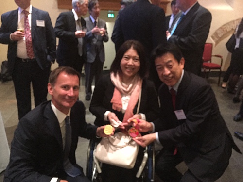 今回、日英21世紀委に初参加し、今日のセッションで素晴らしいプリゼンをしてくださったパラリンピック金メダリスト、大日方邦子さんが獲得した2つの金メダルを手に、夕食後スピーチをしてくれた英国ハント保健大臣とともに記念撮影。
