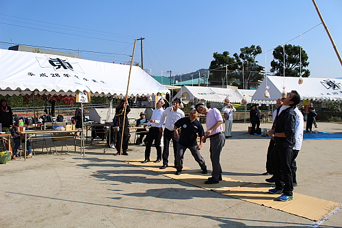 開会式、ラジオ体操に続き、プログラム1番の「パン食い競争」に参加。