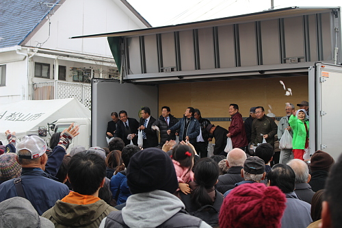 多くの参加者で賑わう中、お餅まきにて皆さんと楽しく交流させていただく。