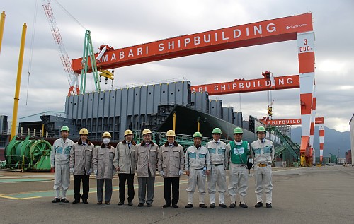 続いて、全長400メートル世界最大級コンテナ船の前で一枚。