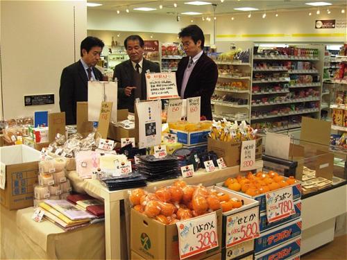 大崎ゲートシティB1Fにある「リラック」とタイアップし、その店内にオープンしたNPO法人「なもし開縁隊」(門屋哲朗代表)が手がける愛媛物品コーナーを激励をかねて見学。