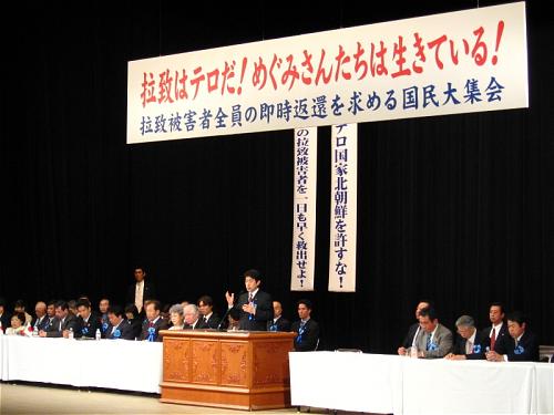 家族会・救う会・拉致議連の三団体共催となる国民集会が日比谷公会堂で開催され、急遽かけつけた安倍総理のあと、私も担当大臣として拉致問題解決への強い意志を述べる。