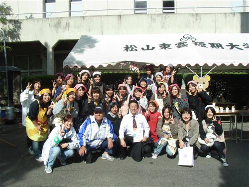 松山東雲女子大学におじゃましました。学生達の手作りのお餅や唐揚げを堪能しました。(ソフトテニス部の皆さんと)