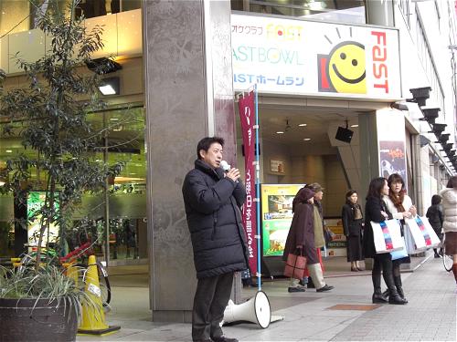 新春初売りで大いに賑わう商店街にて、街頭演説を行う。行き交う多くの人に励ましのお言葉を頂く。