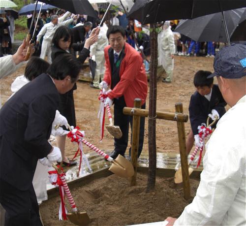 平成20年度愛媛県植樹祭にて、小雨が降る中、ヤマザクラを植樹する。