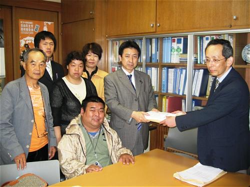 「小規模作業所等成人期障害者施策に関する請願」で上京してこられた地元のきょうされんの皆さんと面会。障害者自立支援法での応益負担の厳しい現状や国連で採択された障害者権利条約の日本の対応など話を聞く。