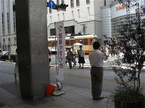 初夏の日曜、行き交う人で賑わう商店街にて、後期高齢者医療制度などについての街頭演説を行う。演説の途中、多くの方々に励ましのお言葉を頂く。